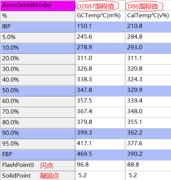 ⑤ ASTM D2887和ASTM D86餾程闡發成果及碳數含量、閃點、凝結點值: